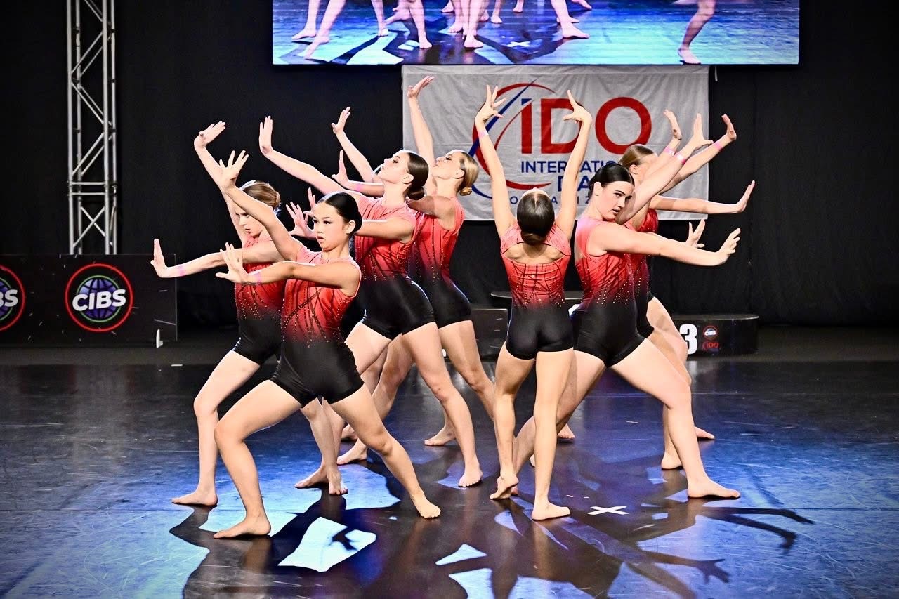 Keira Schumack (centre) competes alongside her teammates in a group acrobatic dance at the IDO World Acro Dance Championships in Italy, where Team Canada earned podium finishes. (Ashley Schumack/Facebook)Schumack also credited the support of her coaches along the way, including Team Canada head coach Lexy Cox and Courtney Smith, the studio director at STAND OUT Dance Collective, where she trains and teaches.