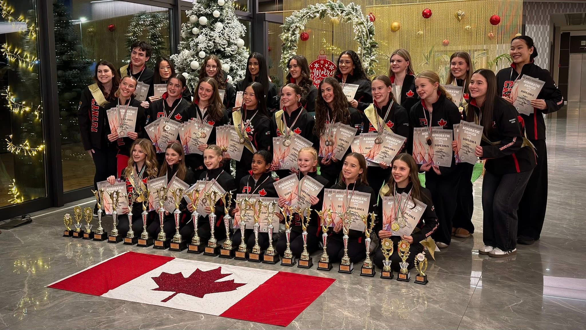 Members of Team Canada pose with their medals after competition at the IDO World Acro Dance Championships in Italy in November. (Ashley Schumack/Facebook)She said the experience changed her daughter — not just as a dancer, but as a person.